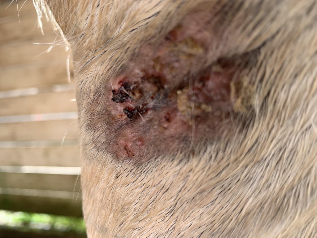 - Nesselfieber („Pickel“ oder Flecke, die den Körper überziehen und oft ein gelbliches Sekret absondern)